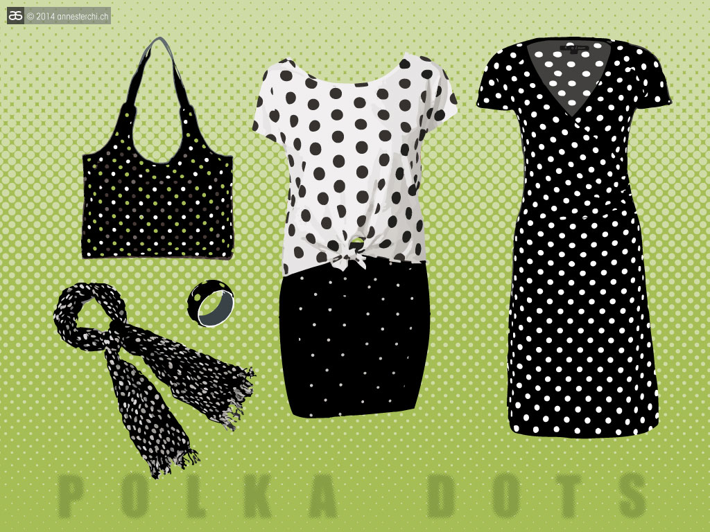 «Punkt, Punkt, Komma, Strich, fertig ist das Mondgesicht», heisst es in dem beliebten Kinderversli. Kleine und grosse Punkte auf diversen Kleidungsstücken oder auf Wohnaccesoires gab es immer wieder. Diesen Frühling/Sommer finden wir in den Geschäften eine immense Vielfalt an gepunkteten Kleidern, Handtaschen, T-Shirts, Hosen, Schals. Der Polka Dots-Trend präsentiert sich diesmal in grossen bunten lustigen Punkten, oft als Kombination aus gepunktetem Oberteil (Top, T-Shirt) und gepunkteter Unterteil (Hose oder Rock).